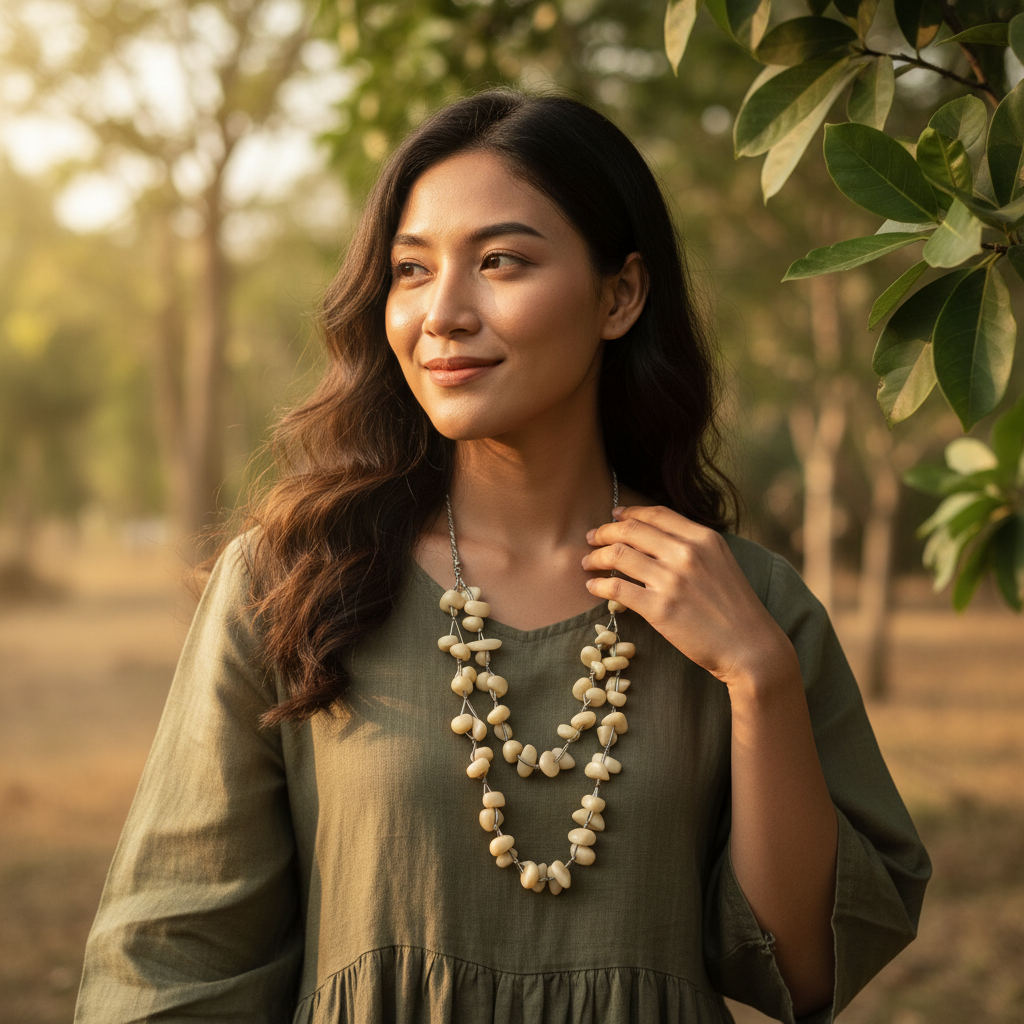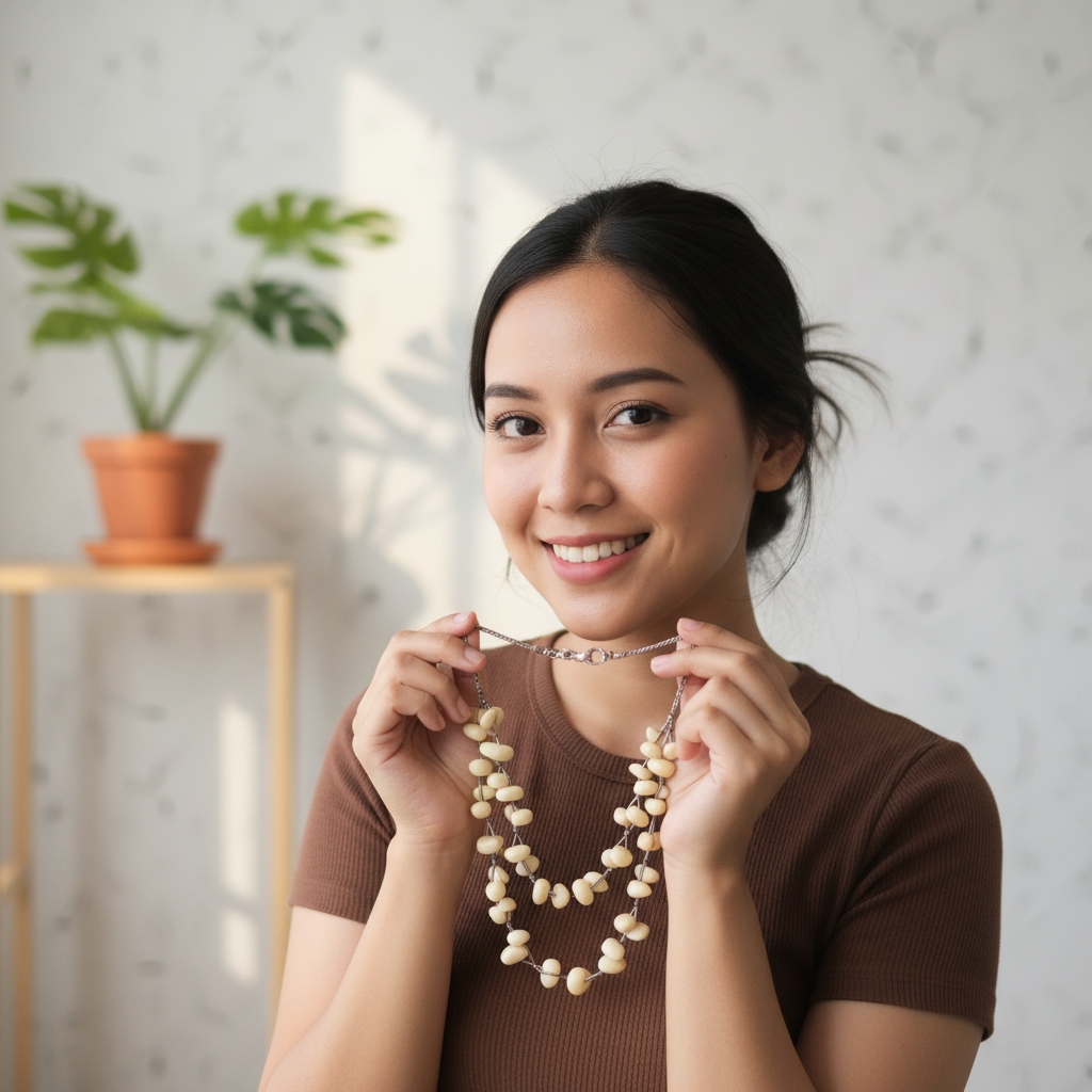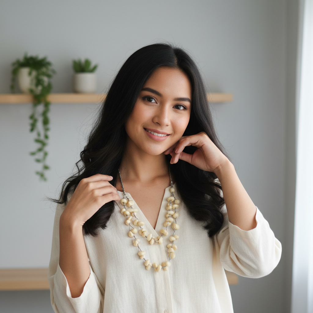 Ingin aksesoris yang netral tapi tidak membosankan? Kalung Manik Etnik Bone White ini jawabannya. Dengan bentuk butiran manik yang organik (tidak bulat sempurna), kalung ini menghadirkan kesan seni yang tinggi (artsy) dan tidak kaku.