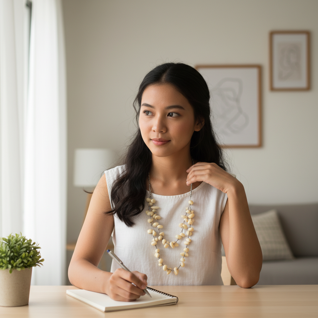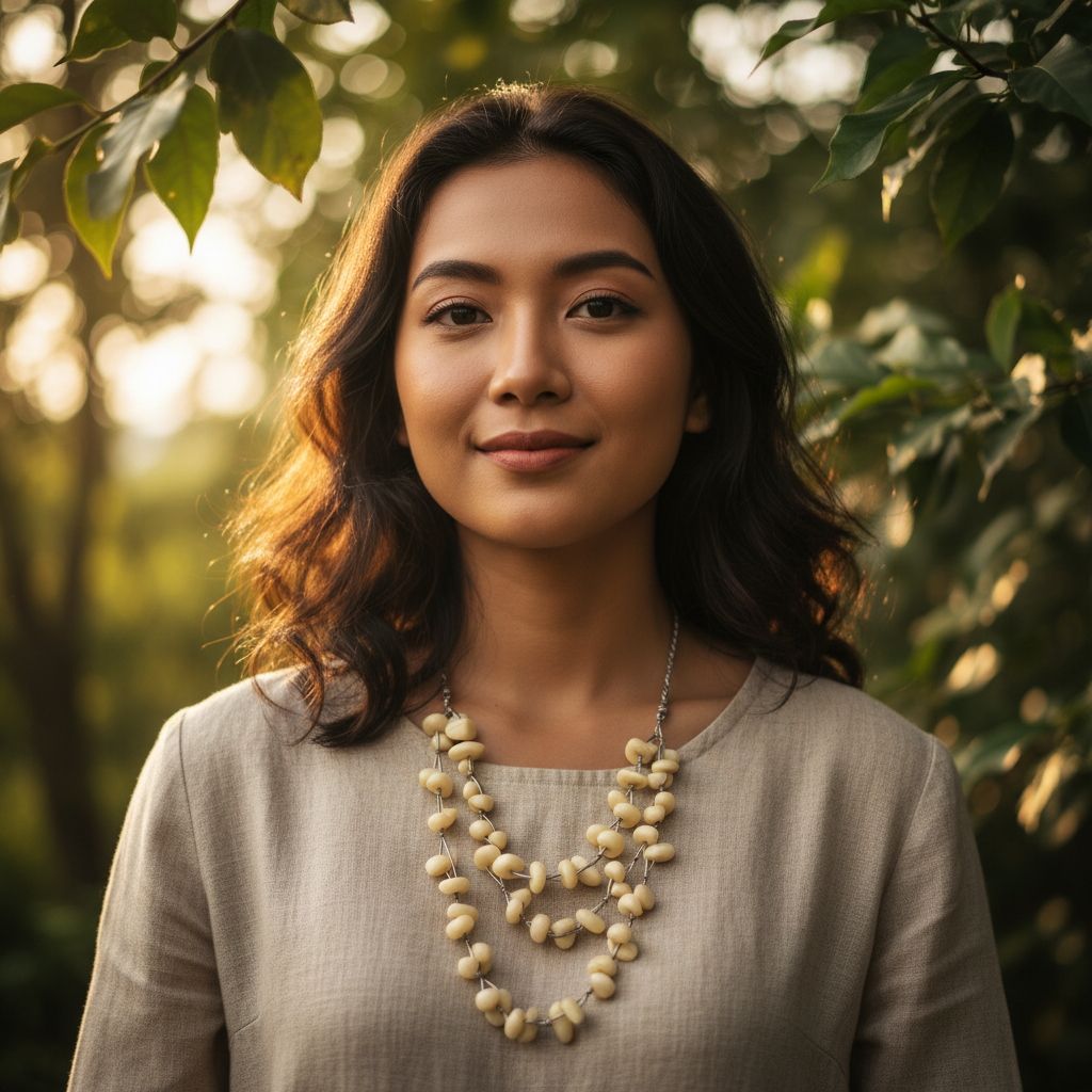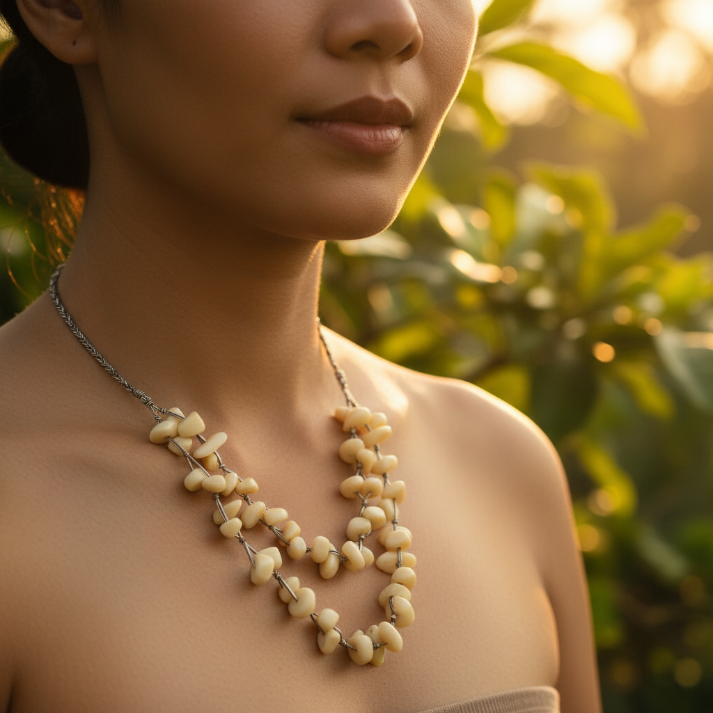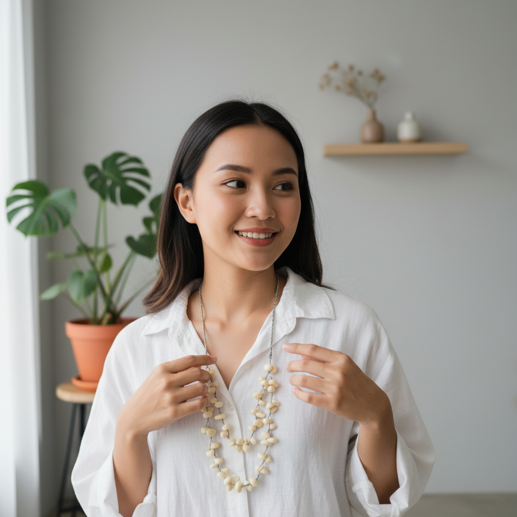 Ingin aksesoris yang netral tapi tidak membosankan? Kalung Manik Etnik Bone White ini jawabannya. Dengan bentuk butiran manik yang organik (tidak bulat sempurna), kalung ini menghadirkan kesan seni yang tinggi (artsy) dan tidak kaku.