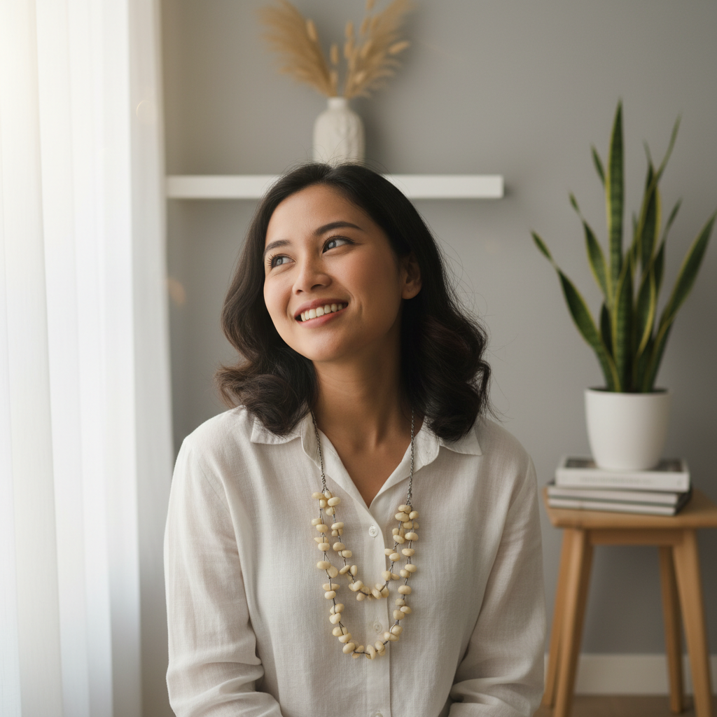 Warna Netral Serbaguna: Warna Putih Gading/Krem adalah warna “aman” yang masuk ke hampir semua warna baju—mulai dari batik, kemeja hitam, hingga dress bunga-bunga.